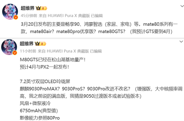 【CNMO科技音问】3月4日,数码博主“超维界”炫耀,华为将于3月20日发布畅享90机型及鸿蒙智选(家居、家电)等。同期,该博主还说起华为Mate 80系列或有新增机型,但具体型号尚未明确,意象可能为Mate 80 Air、Mate 80 Pro优享版或Mate 80 GTS,并瞻望Mate 80 GTS将推迟至4月发布。