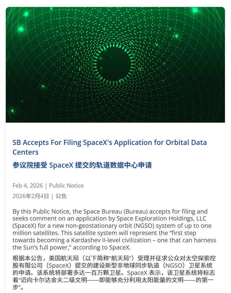 2026年1月30日,SpaceX负责向好意思国联邦通讯委员会(FCC)提交央求。