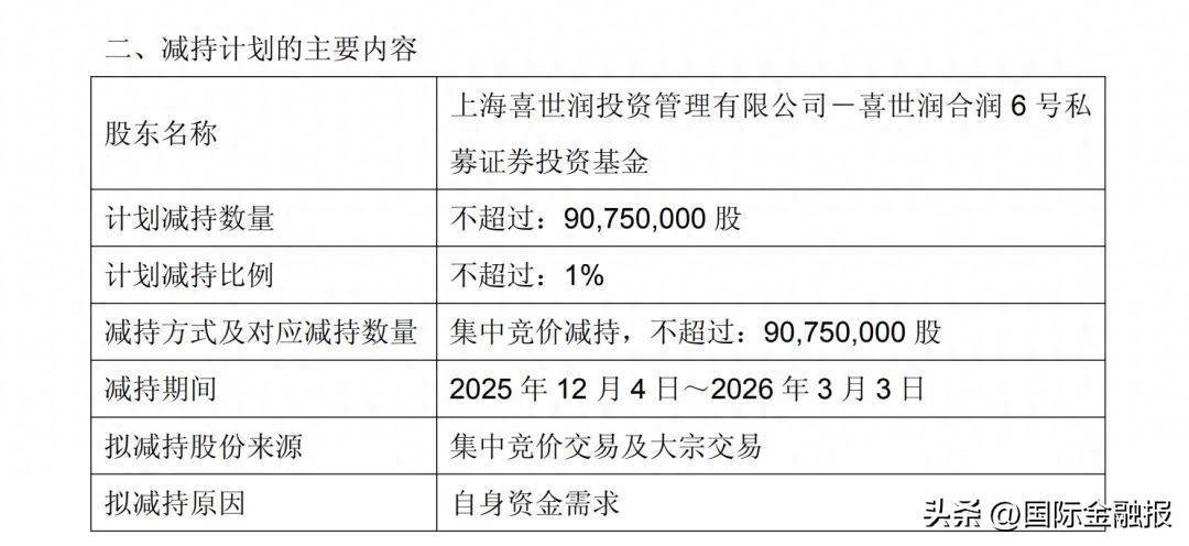 公司合手股5%以上鞭策、董事长张轩松及一致活动东说念主“上海喜世润投资科罚有限公司—喜世润合润6号私募证券投资基金”,因自己资金需求,拟减合手最多9075万股股份,减合手将在公告之日起十五个往复日后的三个月内以蚁合竞价往复花式进行,价钱视商场情况笃定。